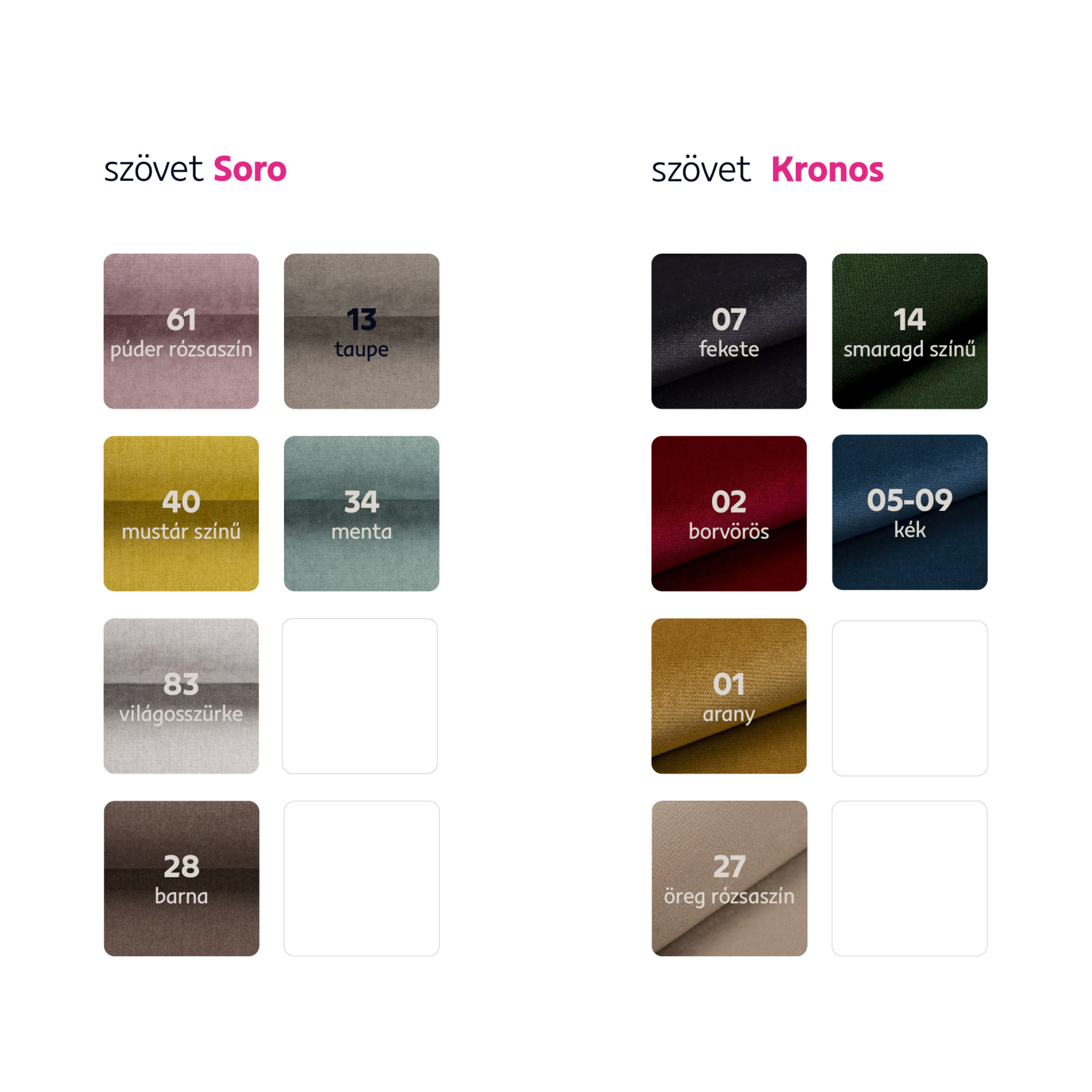 Rendelés lehetséges 6 féle színváltozatban Soro vagy Kronos szövetből, ár 151 900 Ft. Egyedi megrendelés esetén szükség van az adott összegnek a 20%-át befizetni,mint előleg. Az előleg befizetése után az Ön követelményét benyújtjuk a gyártónak. Szállítási idő 8-10 hét.