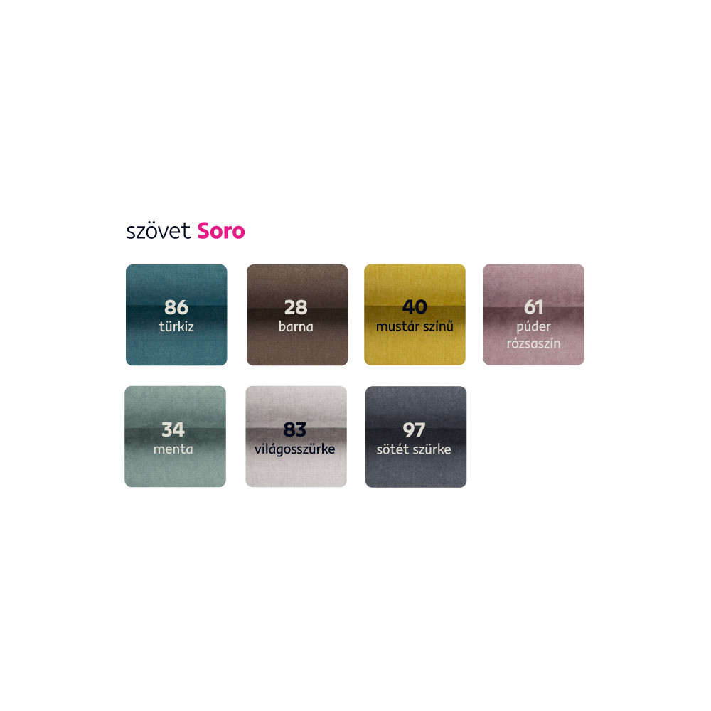 A Soro szövet 7 színárnyalatában rendelhető ár 808 900 Ft. A szállítási idő 6-8 hét. Egyedi megrendelés esetén az összeg 20%-át előlegként szükséges befizetni. Az előleg befizetése után a megrendelése gyártásba kerül.