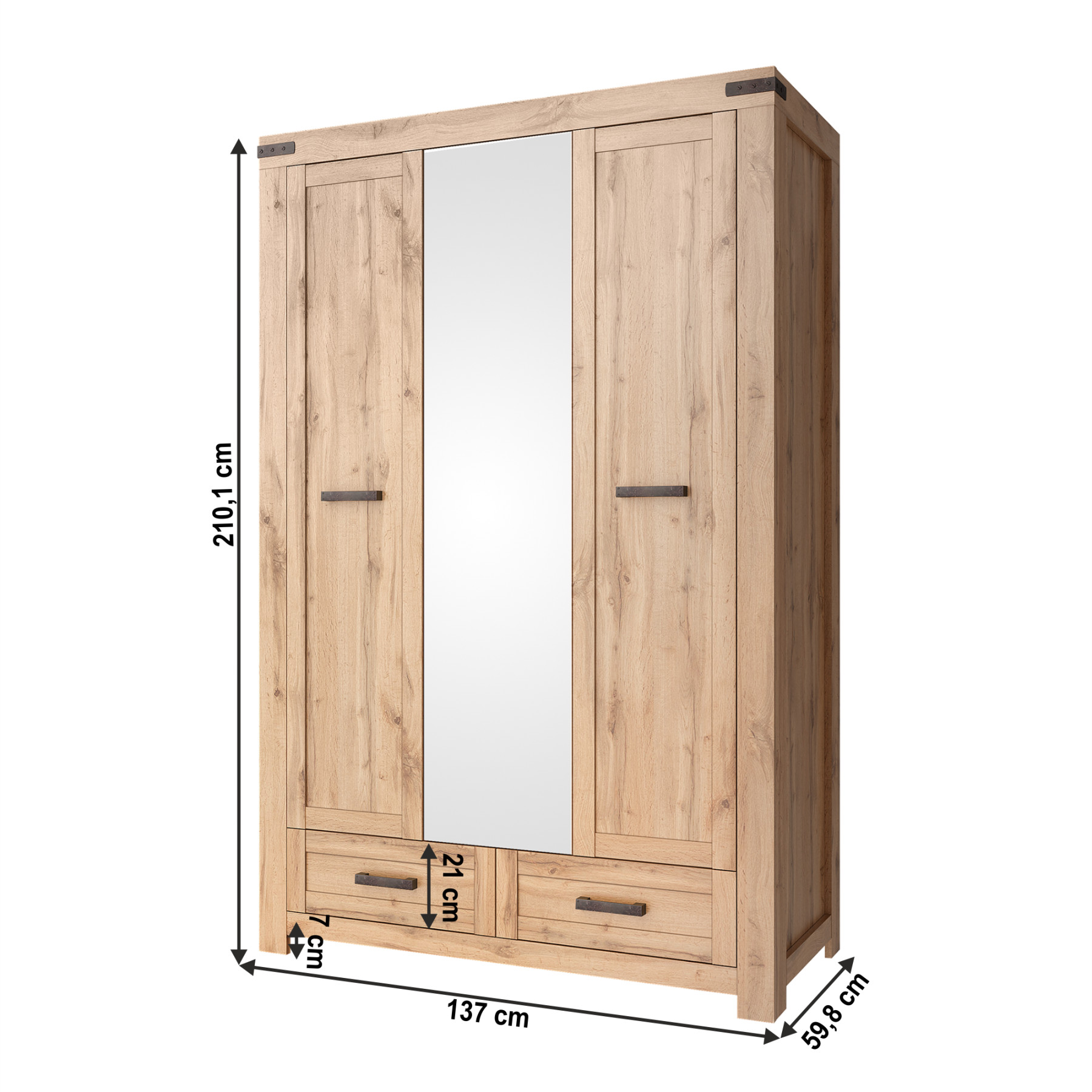 Szekrény tükörrel Moratiz 3D2S Anyag: laminált DTD/MDF/műanyag/üveg Szín: wotan tölgy Méretek (SzxMéxMa): 137x59,8x210,1 cm Lábak magassága 7 cm Anyag vastagsága: 1,6 - 2,2 cm Kombinált Háromajtós Két szekrény A szekrényben akasztórúd és polcok találhatók Két fiók Fiók magassága: 21 cm Műanyag dekoráció és fogantyúk MDF ajtók Szétszerelt állapotban szállítva