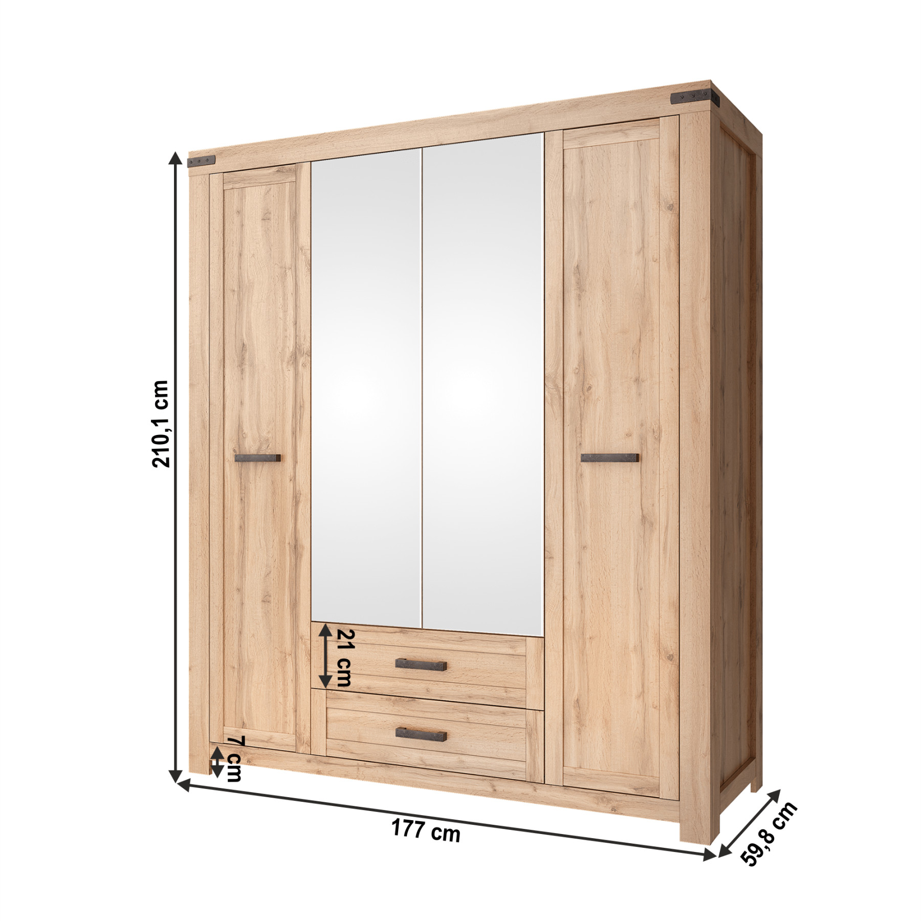 Szekrény tükörrel Moratiz 4D2S Anyag: laminált DTD/MDF/műanyag/üveg Szín: wotan tölgy Méretek (SzxMéxMa): 177x59,8x210,1 cm Lábak magassága 7 cm Anyag vastagsága: 1,6 - 2,2 cm Kombinált Négyajtós Három szekrény A szekrényben akasztórúd és polcok találhatók Két fiók Fiók magassága: 21 cm Műanyag dekoráció és fogantyúk MDF ajtók Szétszerelt állapotban szállítva