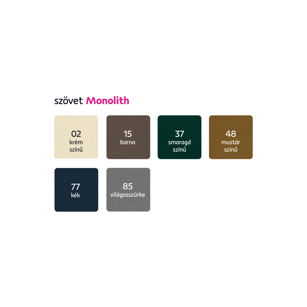 A Monolith szövet 6 színváltozatában megrendelhető ár: 834 900 Ft. Egyedi megrendelés esetén a megadott összeg 20%-át előlegként szükséges befizetni. Az előleg befizetése után a megrendelése gyártásba kerül. A szállítási idő 6-8 hét.