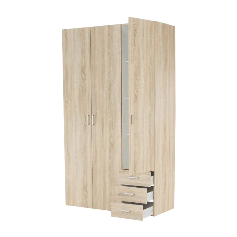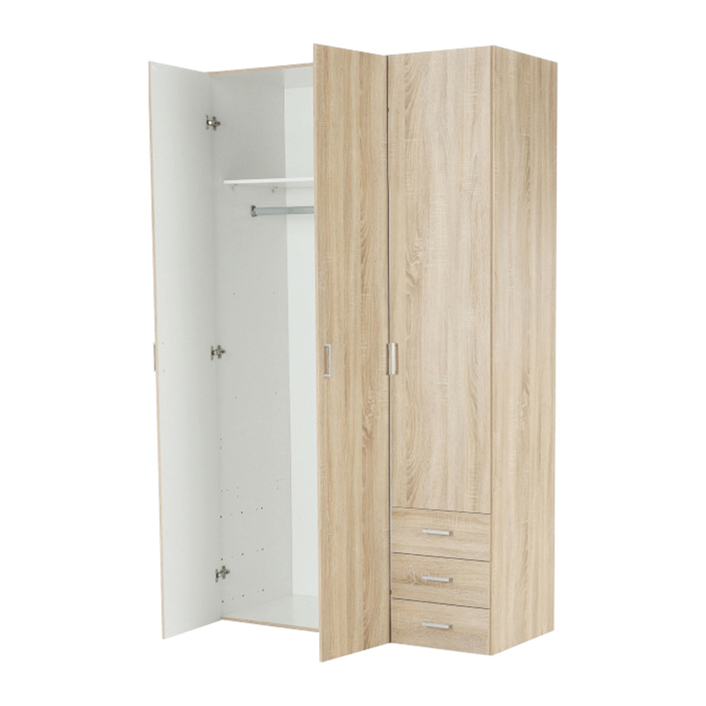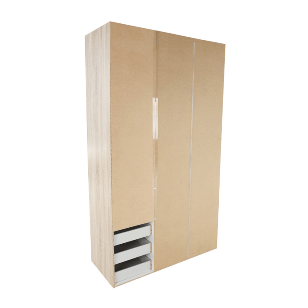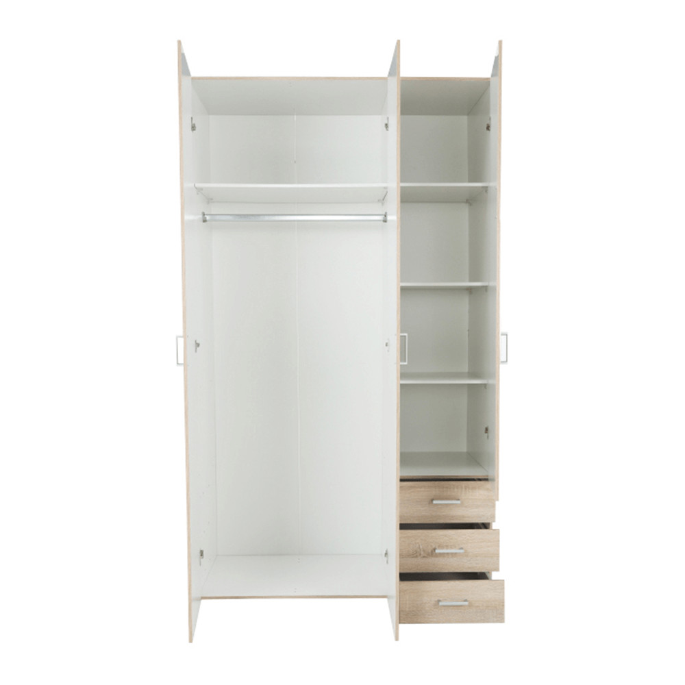 3 ajtós szekrény akasztórúddal és polccal, oldalsó szekrények polcosak, 3 fiók, GWEN 70429